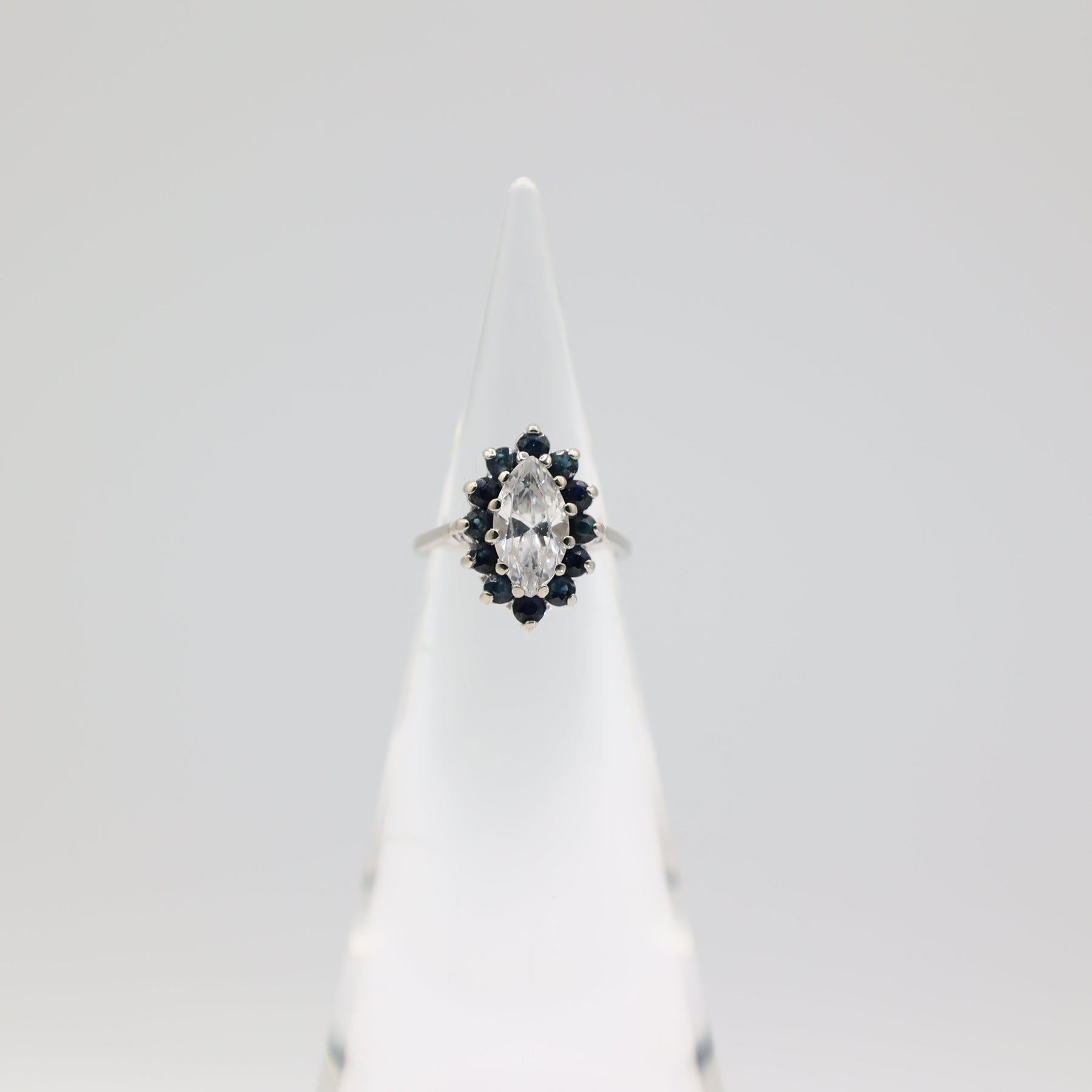 14K White Gold Blue Sapphire and CZ Marquise Stone Ring — Size 5.75