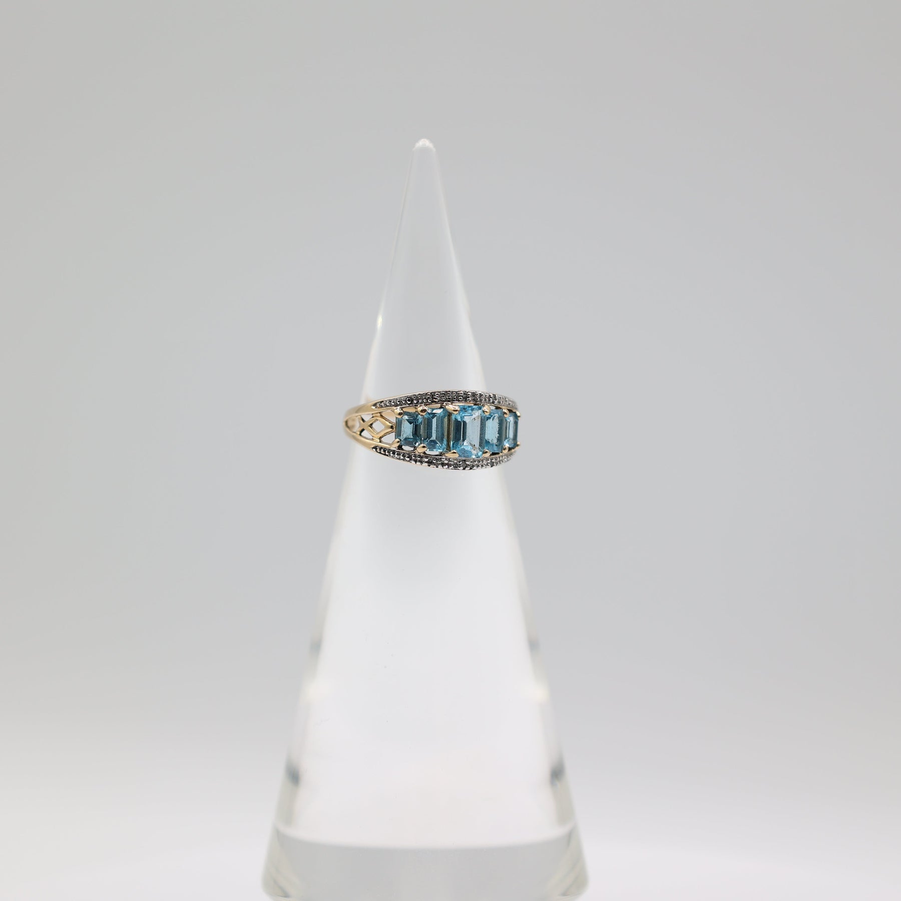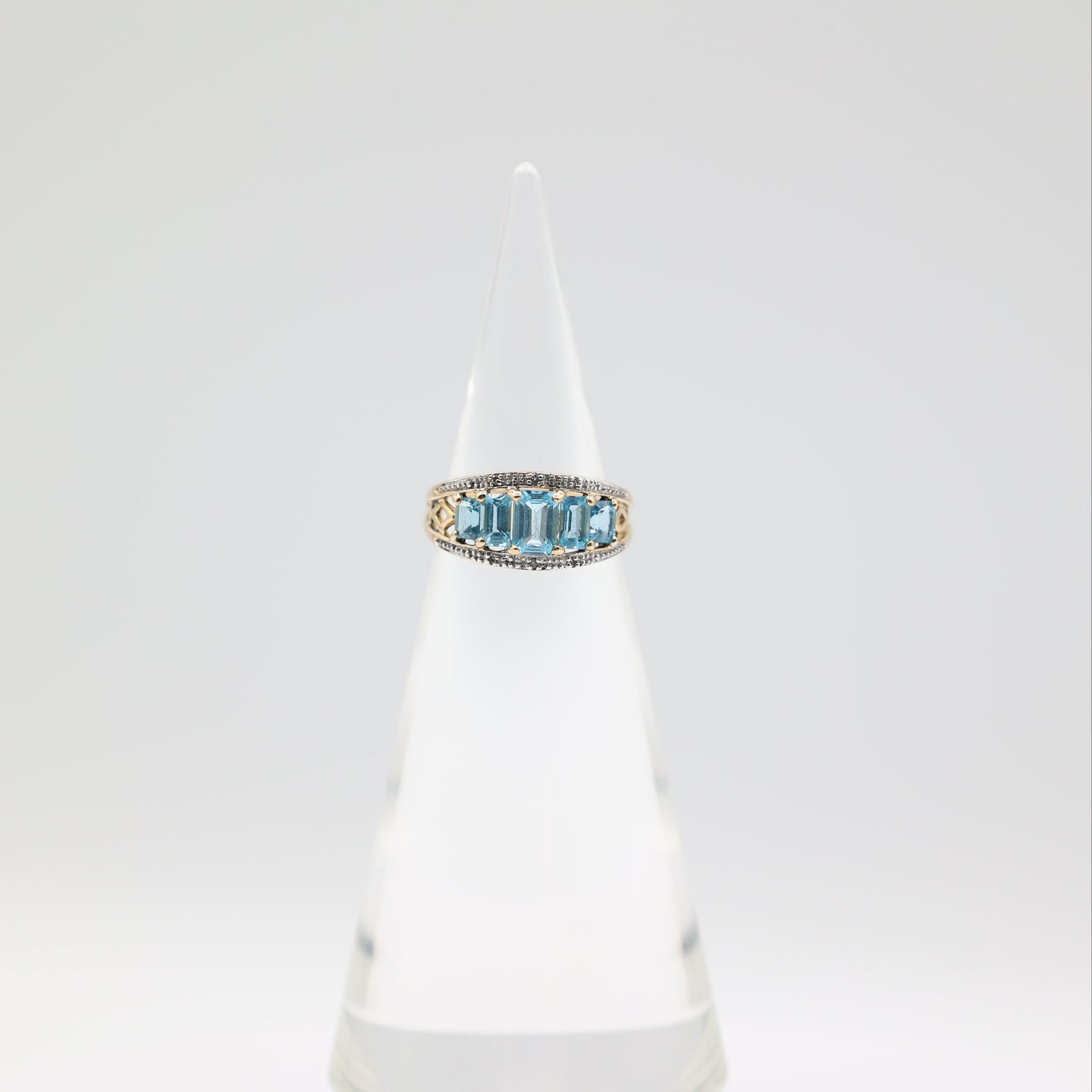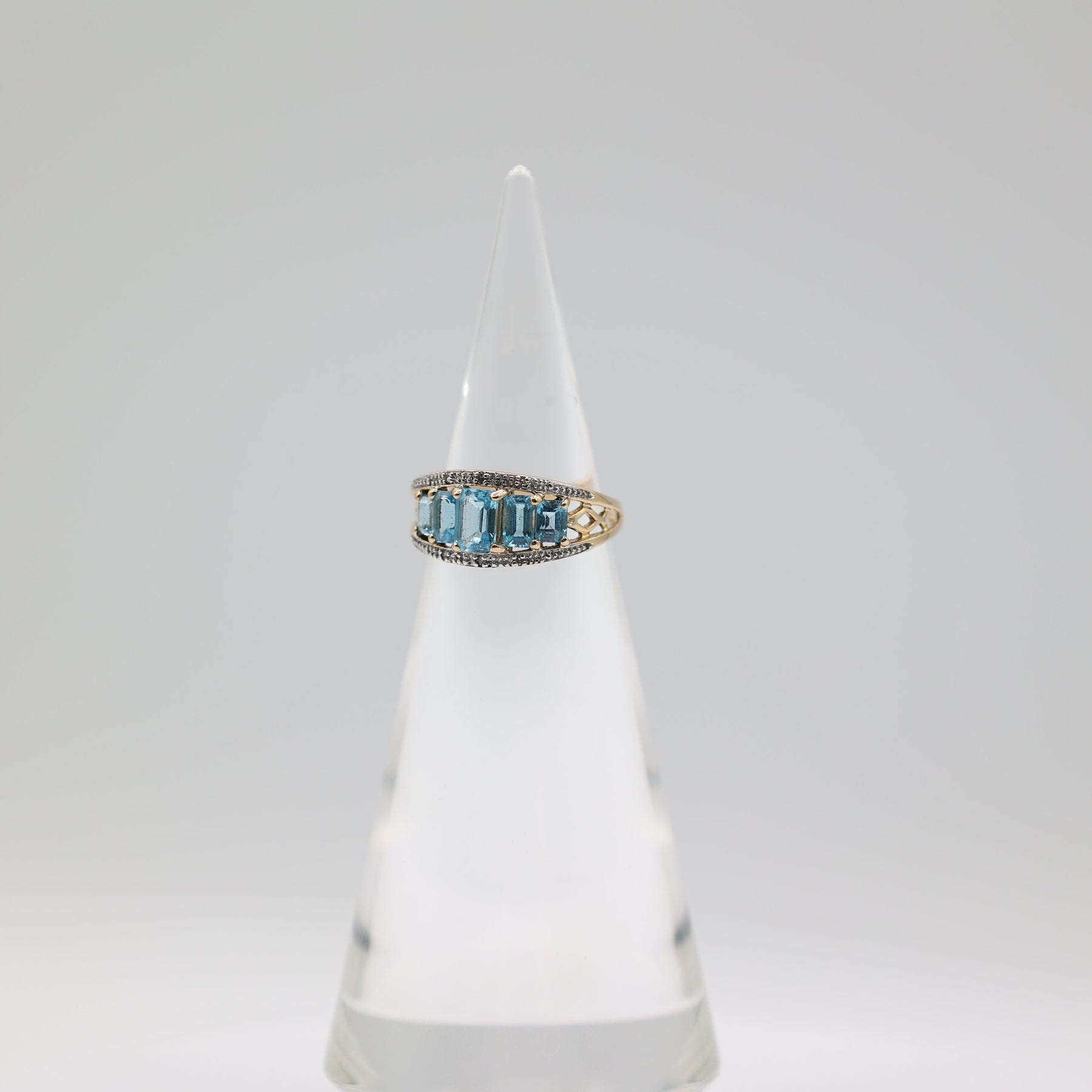 14K Gold 5 Stone Emerald Cut Blue Topaz Diamonds Ring 7.25