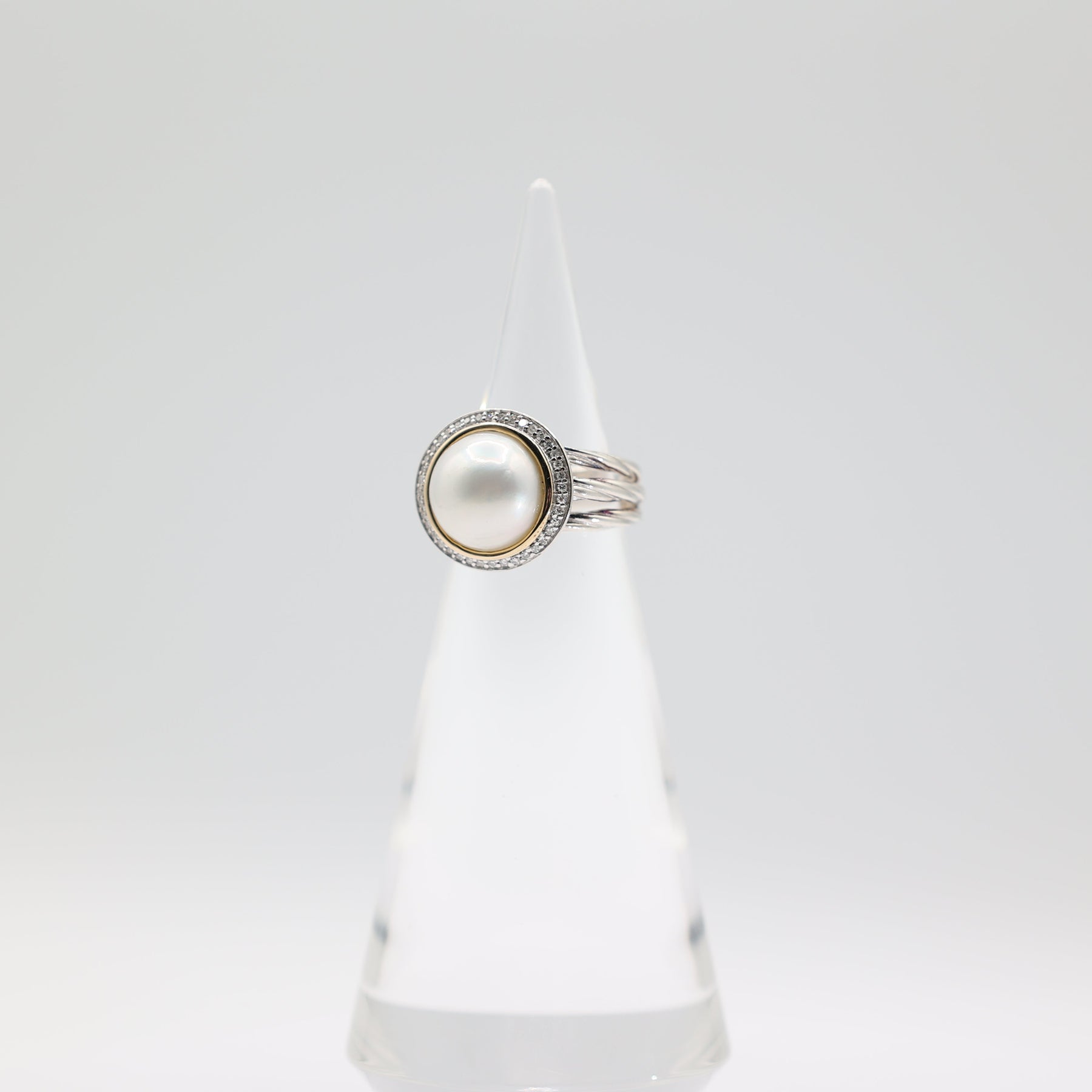 925 Silver/14K Gold RL 11.5mm Pearl & Diamond Halo Twisted Ring Size 6.75