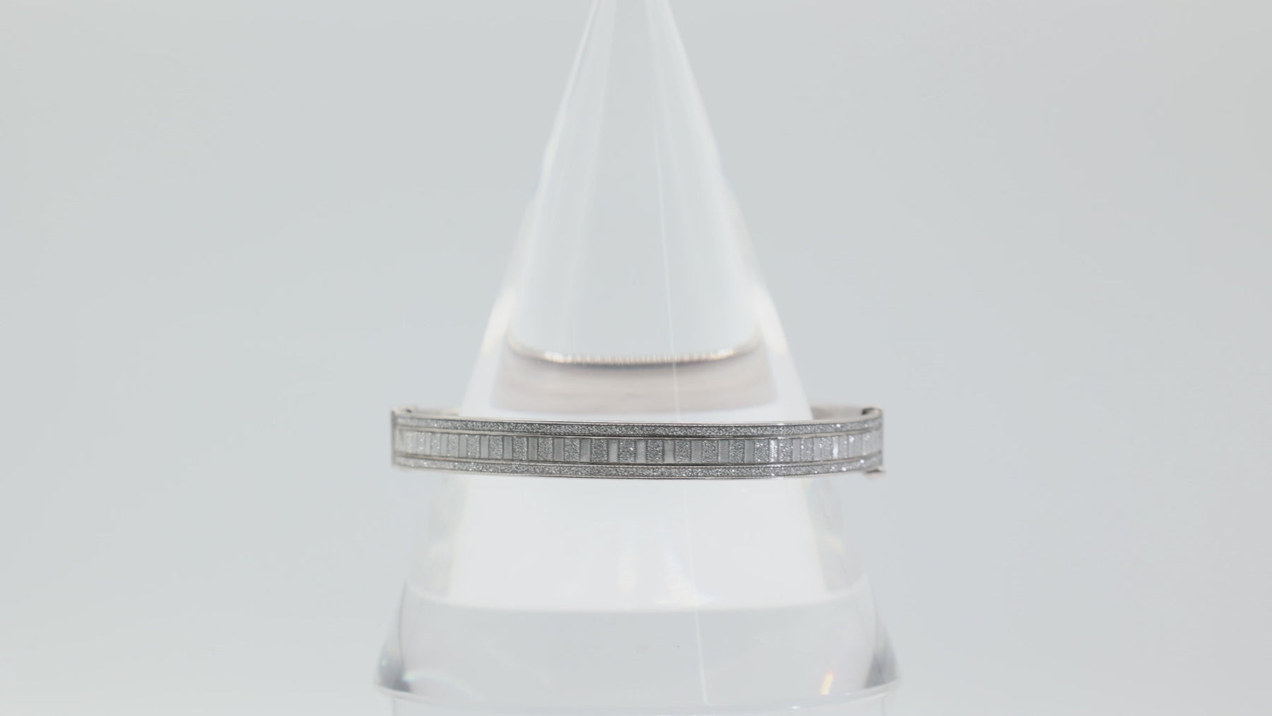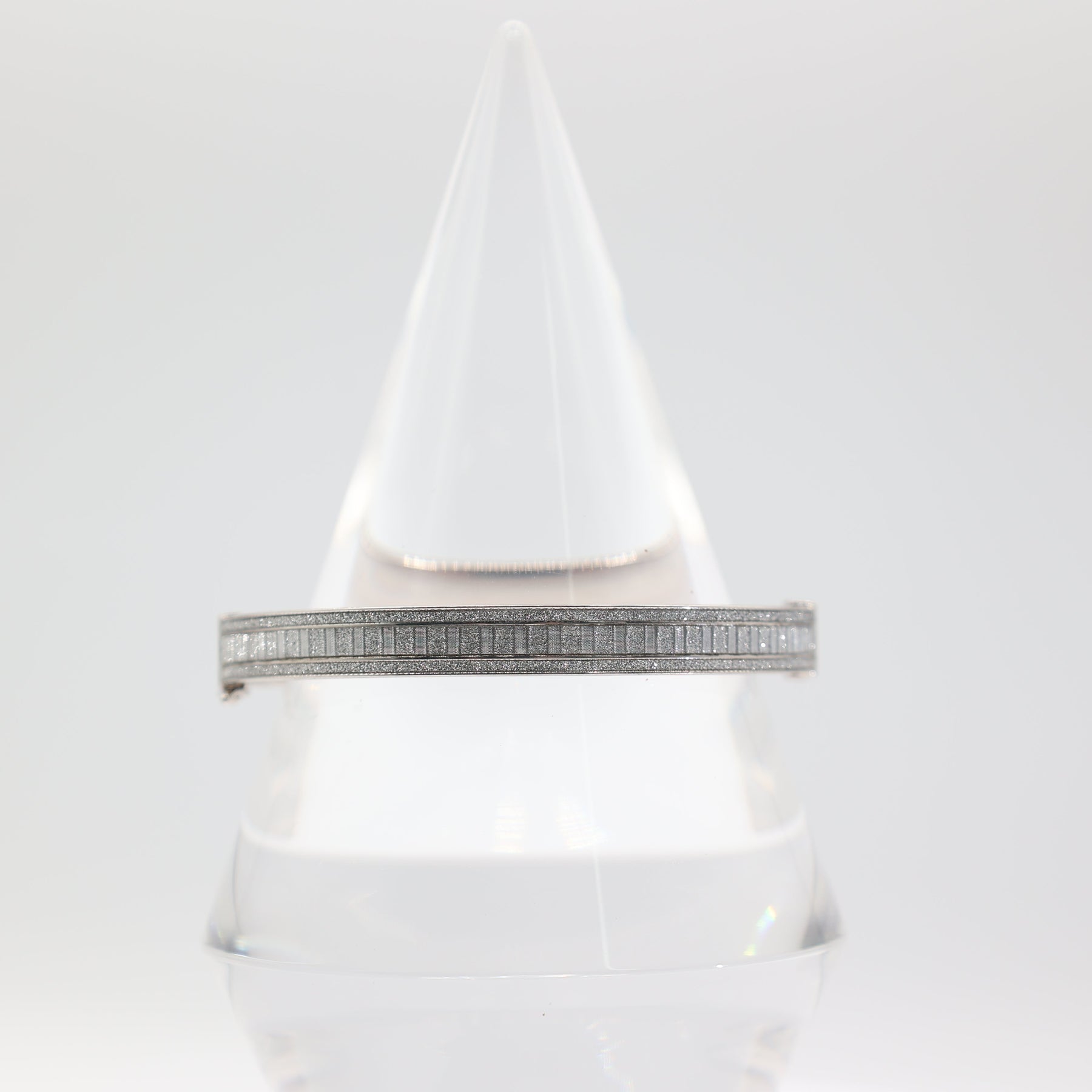 Crafted from genuine 925 sterling silver, this hinged bracelet features a subtle glitter finish that adds a refined shimmer. Its secure hinge design ensures easy wear and a comfortable fit, making it an elegant choice for both everyday style and special occasions. Durable yet lightweight, it combines lasting quality with sophisticated sparkle.