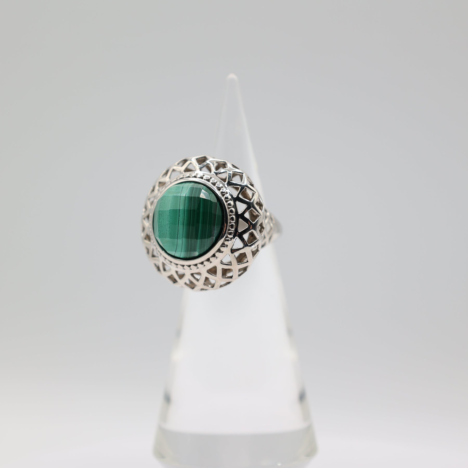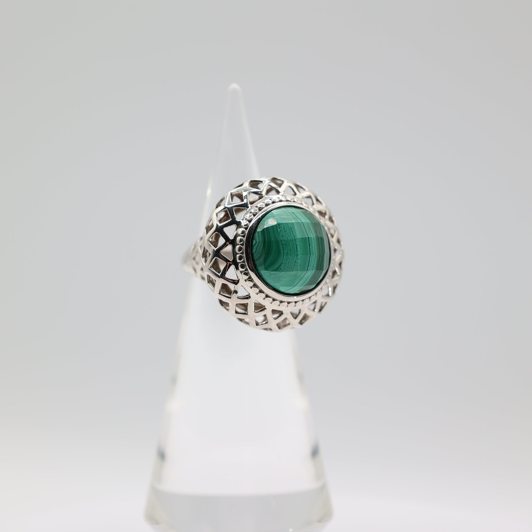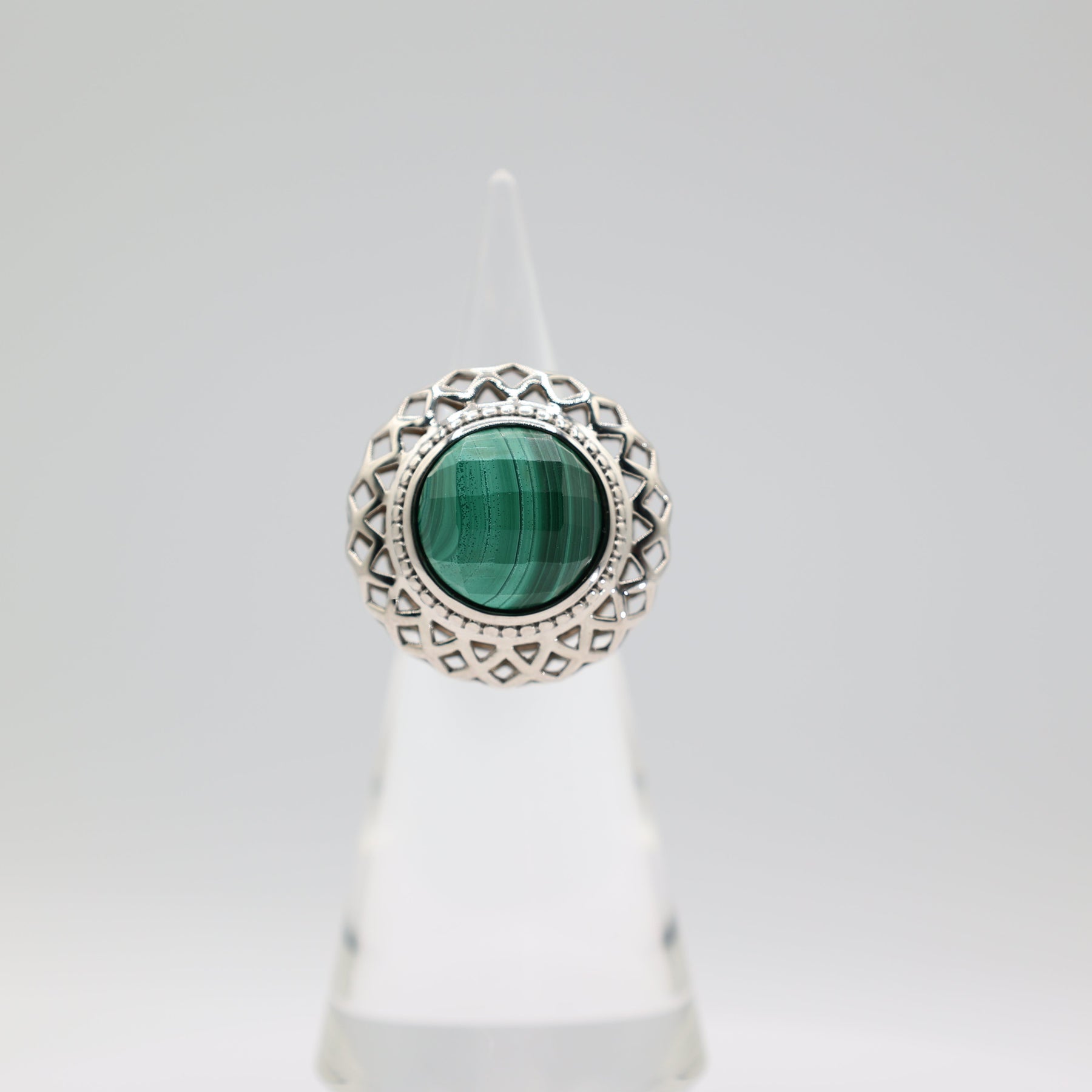 The malachite gemstone is celebrated for its vibrant green hues and distinctive banding, ensuring every ring is truly one-of-a-kind. The secure bezel setting protects the stone while letting its character shine.
