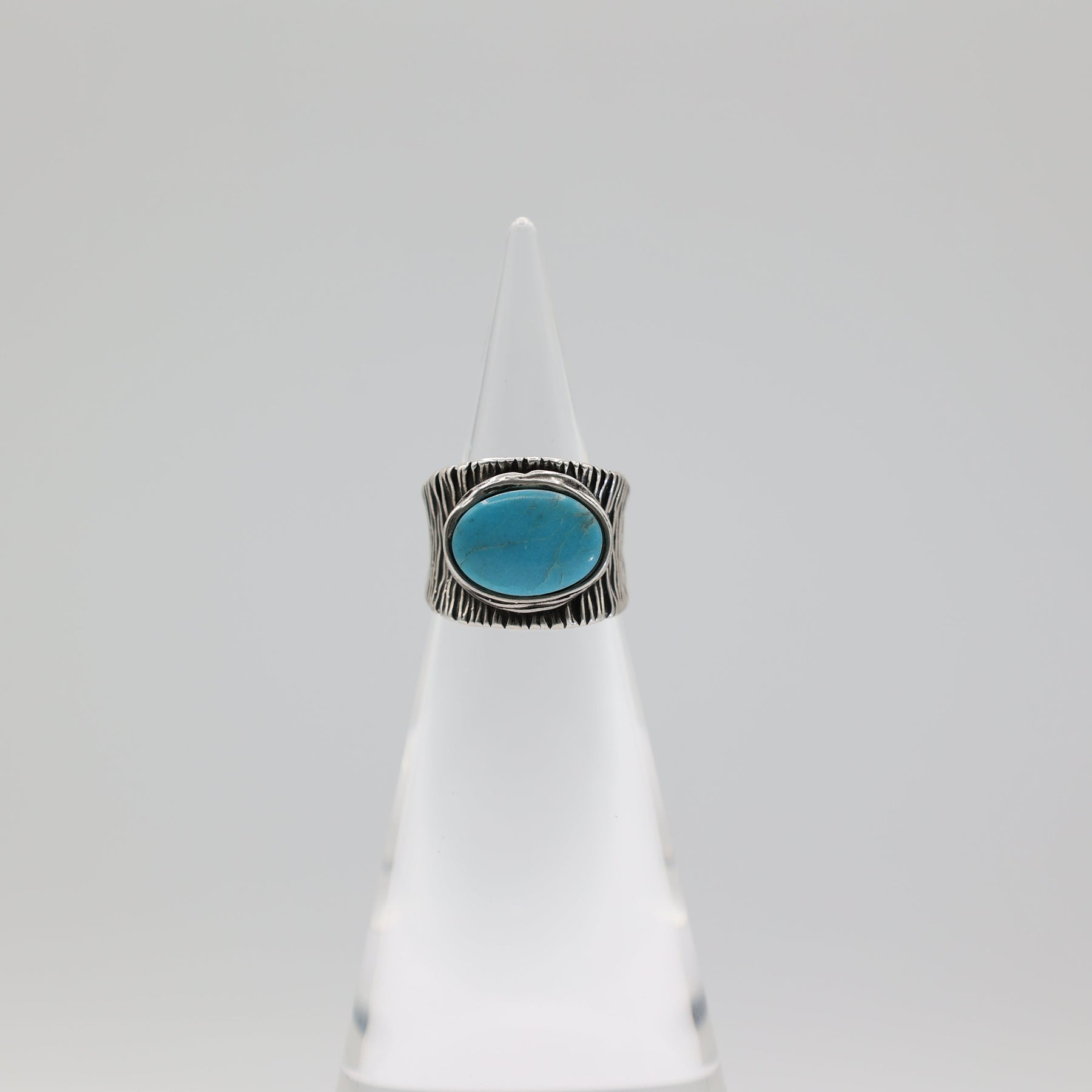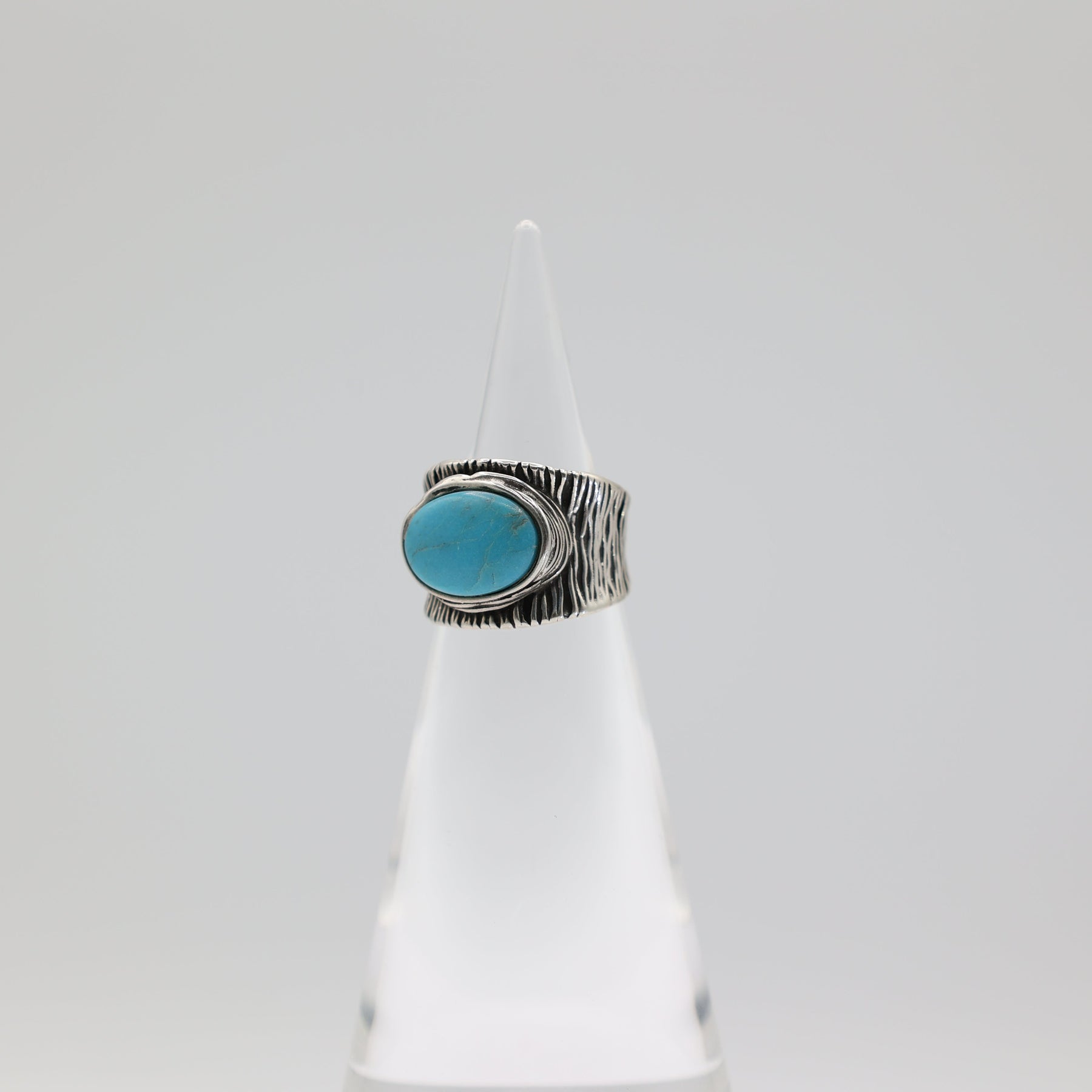 From Annie McConnell's Renewed Elegance, a brand known for refined, renewed jewelry, this 925 sterling silver ring blends nature-inspired texture with a striking turquoise accent. The result is a piece that feels both timeless and contemporary, designed for everyday wear or special occasions.