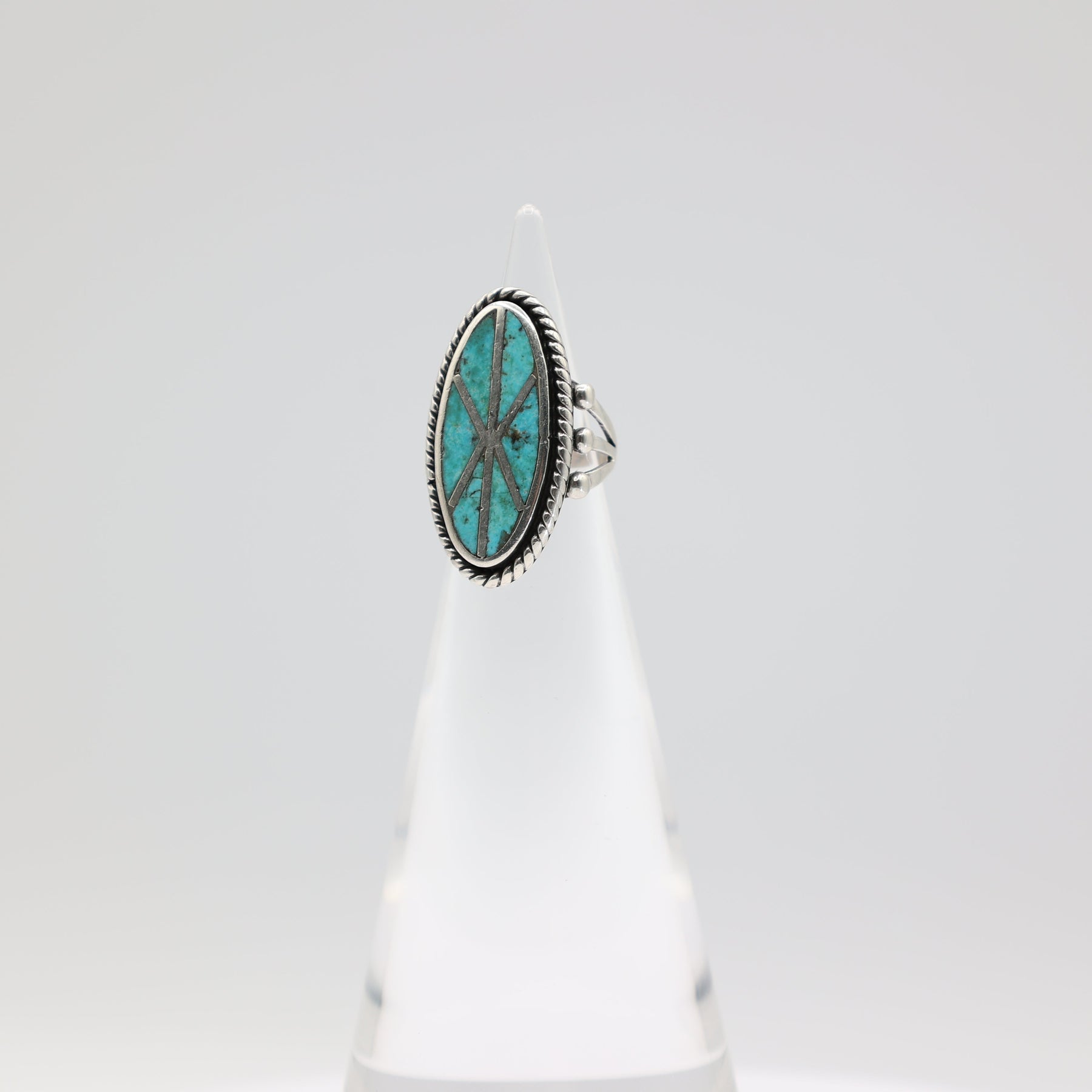 This authentic Navajo ring showcases a striking turquoise stone set in genuine 925 sterling silver, crafted with traditional Native American artistry. The intricate silverwork displays the hallmark design elements characteristic of Navajo jewelry, featuring detailed patterns that frame the natural turquoise centerpiece. Sized at 3, this piece combines cultural heritage with timeless elegance, making it a meaningful addition to any jewelry collection. The sterling silver ensures durability and lasting beauty, while the turquoise's unique coloring adds distinctive character to your everyday wear or special occasions.