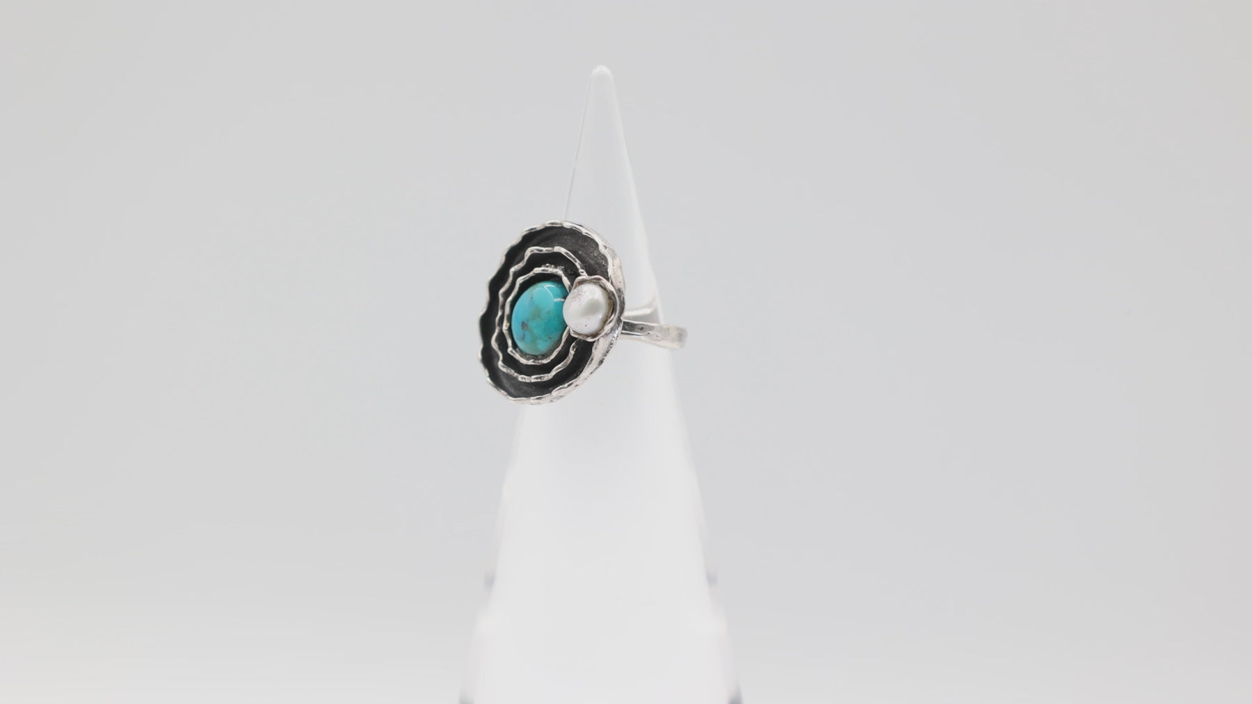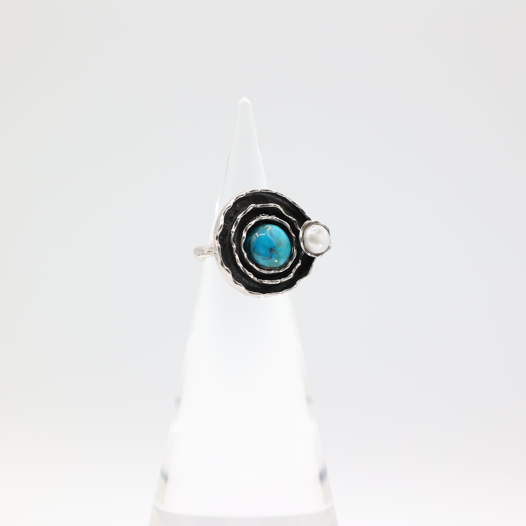925 Turquoise 9mm and Pearl 5mm Intricate Ring - Size 5.5
