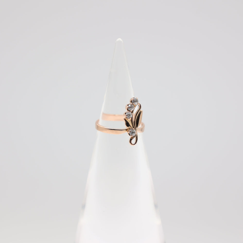 The bouquet motif blends nature-inspired elegance with modern wearability. The 14k yellow gold provides warmth and durability, making it suitable for everyday wear or special occasions. The four 2mm white stones are arranged along a curving stem, creating a subtle, dimensional focal point without overpowering the finger.