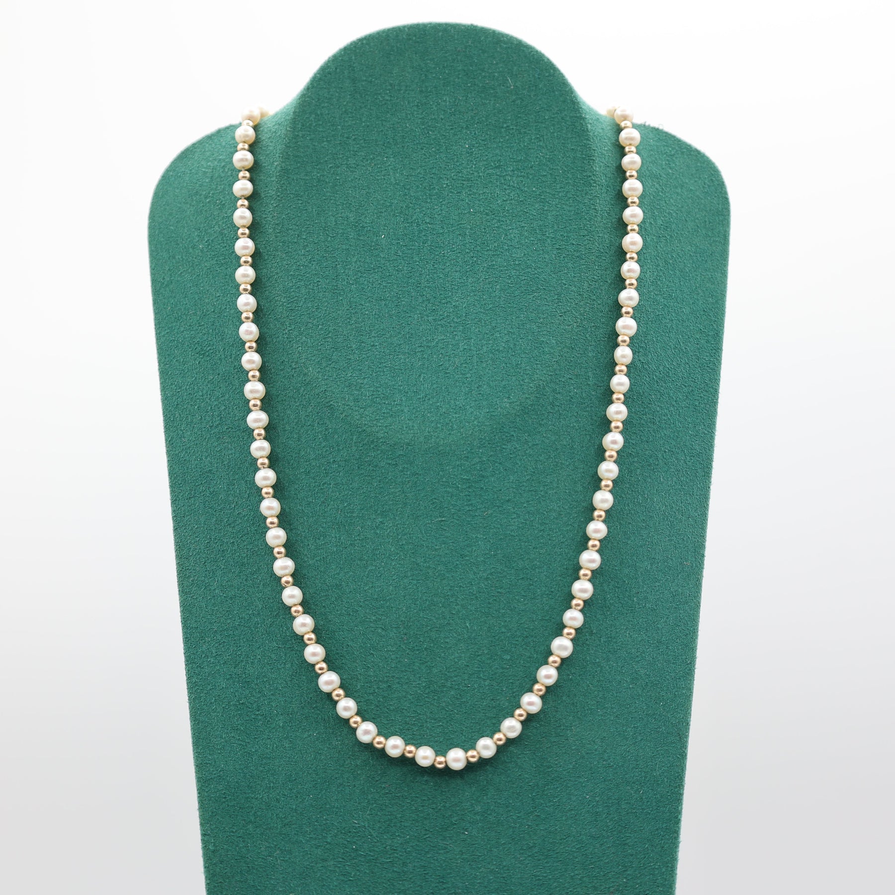 14k Yellow Gold Round Akoya Pearl 5.15mm Beaded Necklace 18 Inch